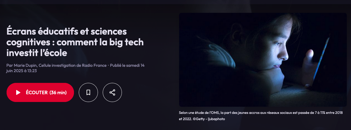 Je recommande vivement le dernier podcast de la cellule d'investigation de Radio France qui met en évidence certaines stratégies de l’industrie technologique pour pousser les pouvoirs publics à un déploiement de plus en plus intense du numérique dans l'éducation.