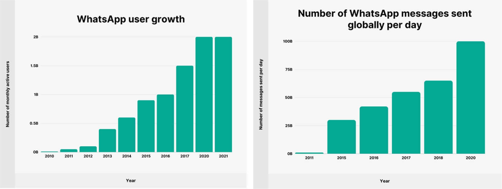 En 2020, los 2 mil millones de usuarios de WhatsApp enviaban más de 100 mil millones de mensajes cada día.