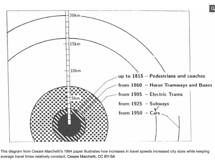 Diagrama de Marchetti (1994): el tiempo de transporte no varía de forma significativa según evolucionan los modos de transporte, mientras aumenta la distancia recorrida.